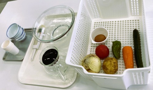 実験1-食材の体積と重量:計量の方法⇒卵M玉1個(60g)を基準に、①人参②ジャガイモ③トマト④きゅうり⑤ピーマン⑥玉ねぎを手ばかりで重さ比べ、物差しで外径を測り、水に浮かべて体積と重さの関係を探求!