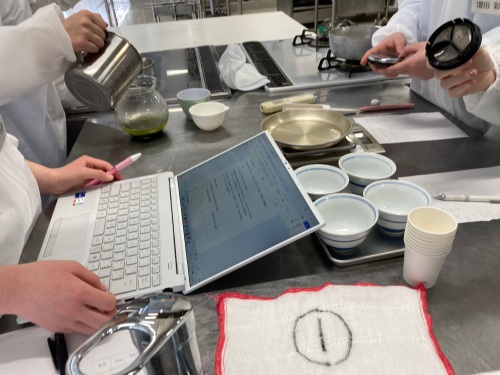 第1回目は調理実習科目「日本料理実習」「中国料理実習」「西洋料理実習」の基本となる事項を実験形式で探求します。授業は2限・3限(200分)の中で、グループメンバーが協力して有意義な探求学習ができました💮