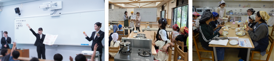 地域の農家や市民、学校との協力関係も築かれ、日野市産の野菜や果物を使った「地産地消活動」や「子どものための料理教室」や「食育イベント」も実施しています。たとえば「日野産大豆プロジェクト」では、安全・安心な大豆を地元で栽培し、学校給食を通して子どもたちに提供することを目的に、日野市・農家・学校関係者・学生が一体となって取り組みました。現在は市民の有志によって活動が継続されています。また、日野市教育委員会や中学校の栄養士の方々と連携し、「テーブルマナー教室」も開催しています。魚を丸ごと1尾使った和食を給食に取り入れ、生徒たちが正しい箸の持ち方や魚のきれいな食べ方などを学ぶ機会となっています。本学の学生は、給食の配膳の支援をおこなっています。
