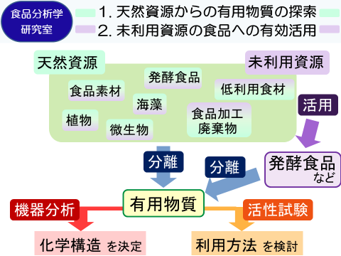 食品には、一次機能(栄養機能)、二次機能(感覚機能)、三次機能(生体調節機能)の3つの機能があり、これらの機能性は食品に含まれる様々な物質によりもたらされるものです。そこで当研究室では、食品に含まれる物質の中から二次機能や三次機能に関与する物質を特定すること、さらには食品中の含有量について明らかにすることを目的に、分析学的および有機化学的手法を用いて研究を進めています。このような研究を進めることで、様々な食品から我々の生活に役立つ物質を見つけたり、食品の価値を高めたりすることが期待できます。また、これまであまり利用されていない資源や全く利用されていない資源のことを、低利用資源や未利用資源と呼びます。これらの低利用および未利用資源を食品へと活用することも当研究室では試みています。