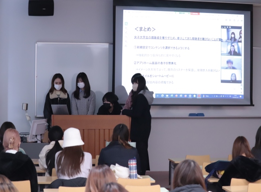 当日は教室と株式会社クロス・マーケティンググループ、株式会社ディー・エヌ・エーの皆様をオンラインで繋ぎ、12グループの学生たちが企画した内容の提案発表を行いました。学生たちは「シニアと女子大生 異色のエンカウンター」といったテーマで、シニア世代のライバー(配信者)と一緒に食事や雑談ができるコミュニティ形成に関する提案。「女子視聴者を離さない!ために」と題し、イメージの改善・機能性の向上といった「女子大生視聴者を離さない機能」に関するシステム改善の提案等、各グループの学生たちが自ら調査し、その結果を踏まえて考えた、様々な提案を行いました。ご参加頂いた企業の皆様には、非常に興味を持って頂け、各発表毎に様々な質問が寄せられました。