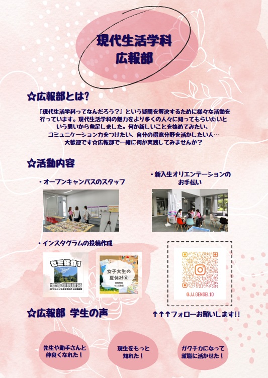 現代生活学科ではオープンキャンパススタッフを担当したり、Instagramを活用した情報発信を行う「学生広報部」が活動をしております。今回は学生広報部の活動をご紹介いたします。