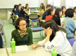 食後は交流会として、昼食時とは違うグループに分かれ、教員・助手・リーダーたちと学校生活の話や授業の話、サークルの話をして盛り上がりました。