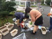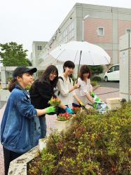 「彩プロジェクト」が始動して早5ケ月が経過しました。この金曜日、19日には5回目となる花の植え替えを行いました。これまでの植え替えは自己流で行っていましたが、今回は大学近くの花屋さん、フローラ・トテミの西山さんと本学警備員の吉田さんのお力をお貸りして、土づくりから花の植え替え方法まで徹底的に教えていただきました。これまで使用していた土をふるいにかけて肥料と酸素を混ぜること、どうすれば華やかに見えるのか、花の配置など多くのことを学びました。一層に華やかな仕上がりになりました。
