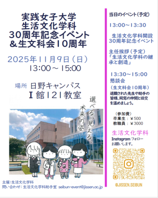 来月、11月9日(日)は「生活文化学科30周年記念」イベントを開催します。