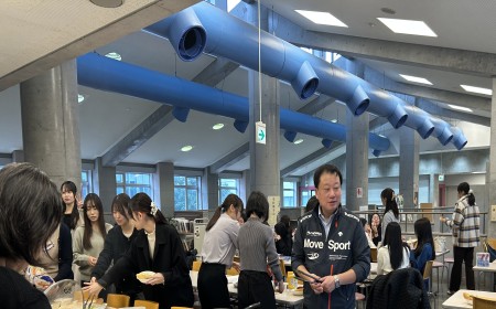 発表会終了後、「学年・専攻の枠を超える」をテーマにした親睦会を桜ホール2階で開催しましたが、これはKickoff後の反省会で学生から寄せられた「他専攻の友人と交流したい」という声を受けて実現した企画です。生活文化学科は生活心理専攻(定員40名)と幼児保育専攻(定員45名)の2専攻で構成されていますので、普段はどうしても専攻単位の行動になりがちです。学生さんたちも日頃から感じていたのでしょう。確かに、学科の団結力、絆を深める上で専攻を超えた交流の場を意識して設けていくことは大事なことです。親睦会のメニューは、ホットドッグ、ポテト、団子、唐揚げ、お菓子などなど。発表後の開放感も手伝って学生も教員もお腹いっぱいになるまで食べ、おしゃべりした、楽しい一時となりました。