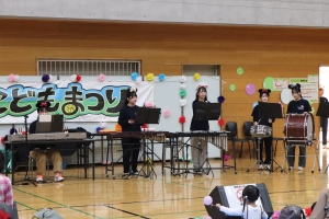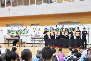 2年生は、1時間のステージの中で、6グループに分かれて「パネルシアター」「ハンドベル」「ペープサート」「合奏」「ダンス」を披露したり、子どもたちも参加できる「ゲーム」を行ったりしました。当日はたくさんの子どもたちの前での発表に緊張していましたが、準備・練習してきた成果を十分発揮することができました。子どもたちと楽しんで活動している様子が印象的でした。