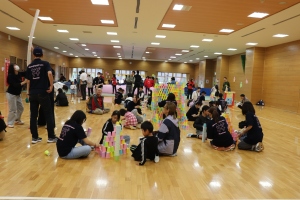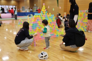 1年生は実践女子大学のブース「あそびのひろば」に2000個のカラー紙コップを用意し、子どもたちと一緒にさまざまなあそびを展開していました。