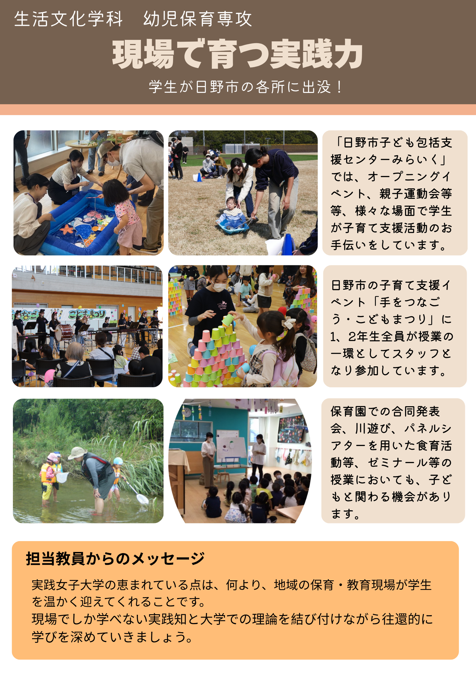 本専攻の一番の特徴は、地域との連携です。学生たちは、日野市内の保育・教育現場で様々な形で子どもたちと関わり、専門職としての実践力を高めています。