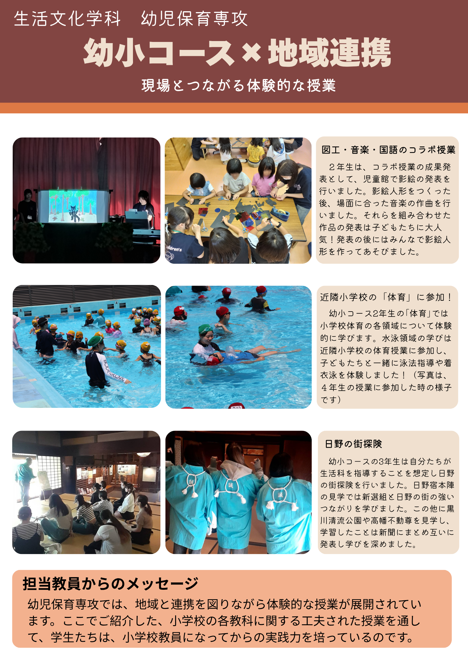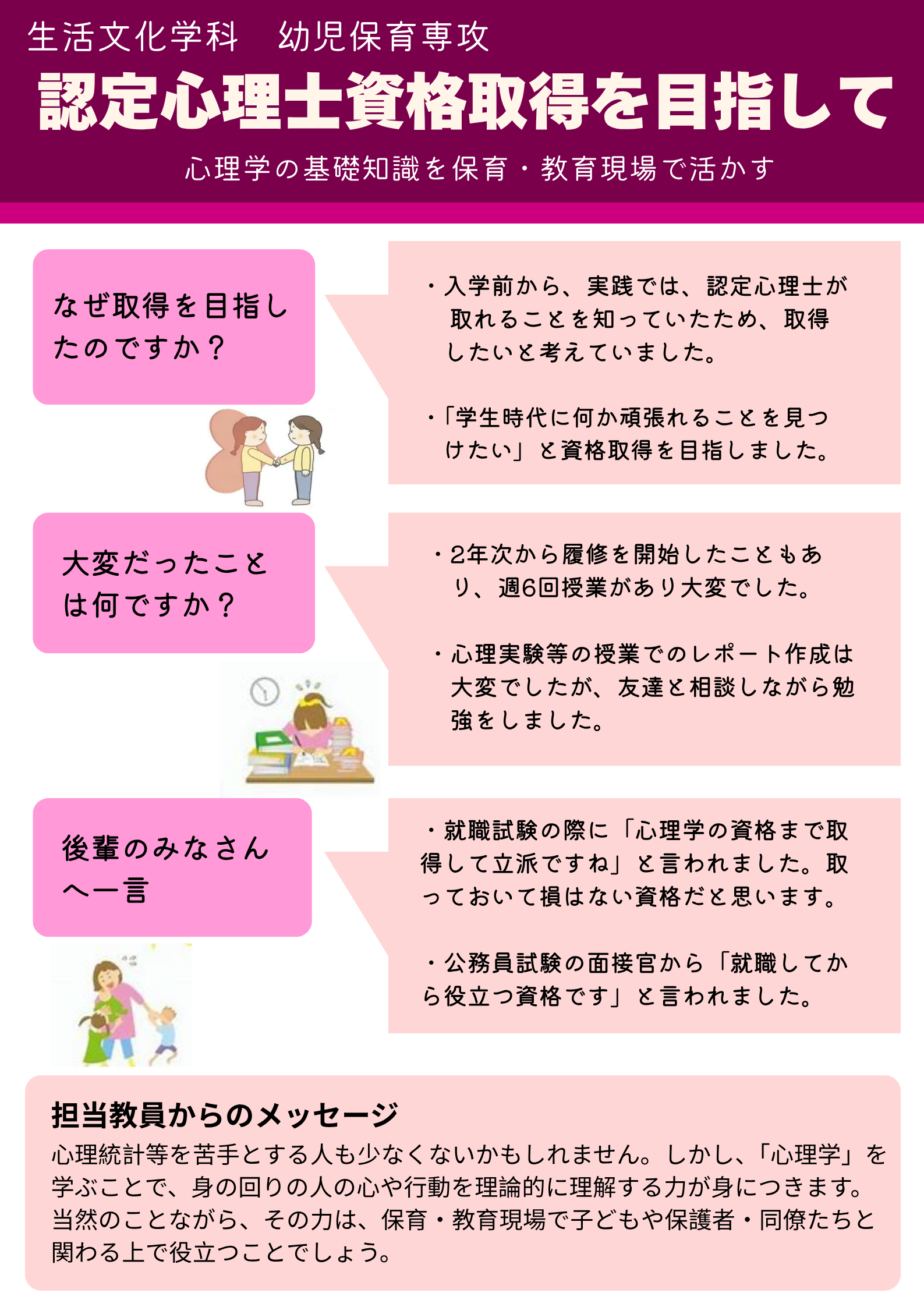 小学校教諭、幼稚園教諭、保育士の専門職を目指し、学修に励む幼児保育専攻の学生たちの姿をお伝えします。今回は、オープンキャンパスでご紹介している4枚のポスターをご覧いただきたいと思います。