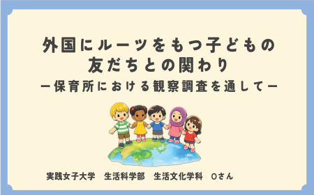 Oさんは、「外国にルーツをもつ子どもの友だちとの関わり-保育所における観察調査を通して-」と題して研究しました。子どもたちの仲間関係に着目したOさんは、一人ひとりの子どもの気持ちを丁寧に描出して考察を重ねました。その結果、友だちとの関わりにおける困り感は、外国にルーツをもつ子どもにとどまらず、日本語を母語とする子どもたちも感じていたことに気づき、保育者の配慮や援助を要する状態は、集団全体にかつ複合的に生じていることを明らかにしました。