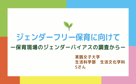Sさんは、「ジェンダーフリー保育に向けて-保育現場のジェンダーバイアスの調査から-」と題し、5歳児を対象に塗り絵や連結式問題を用いた課題実施型調査等を行いました。その結果、将来の夢に関する質問では、男児が乗り物の運転手、女児がパティシエを複数人回答したのに対し、男児がパティシエ、女児が運転手を選択することはなく、子どもたちの職業意識や色彩認識等にジェンダーバイアスがあることを明らかにしました。Sさんは、国内外の先駆的な取り組みも調査し、具体的な提言も行いました。