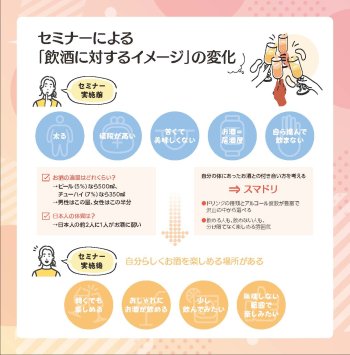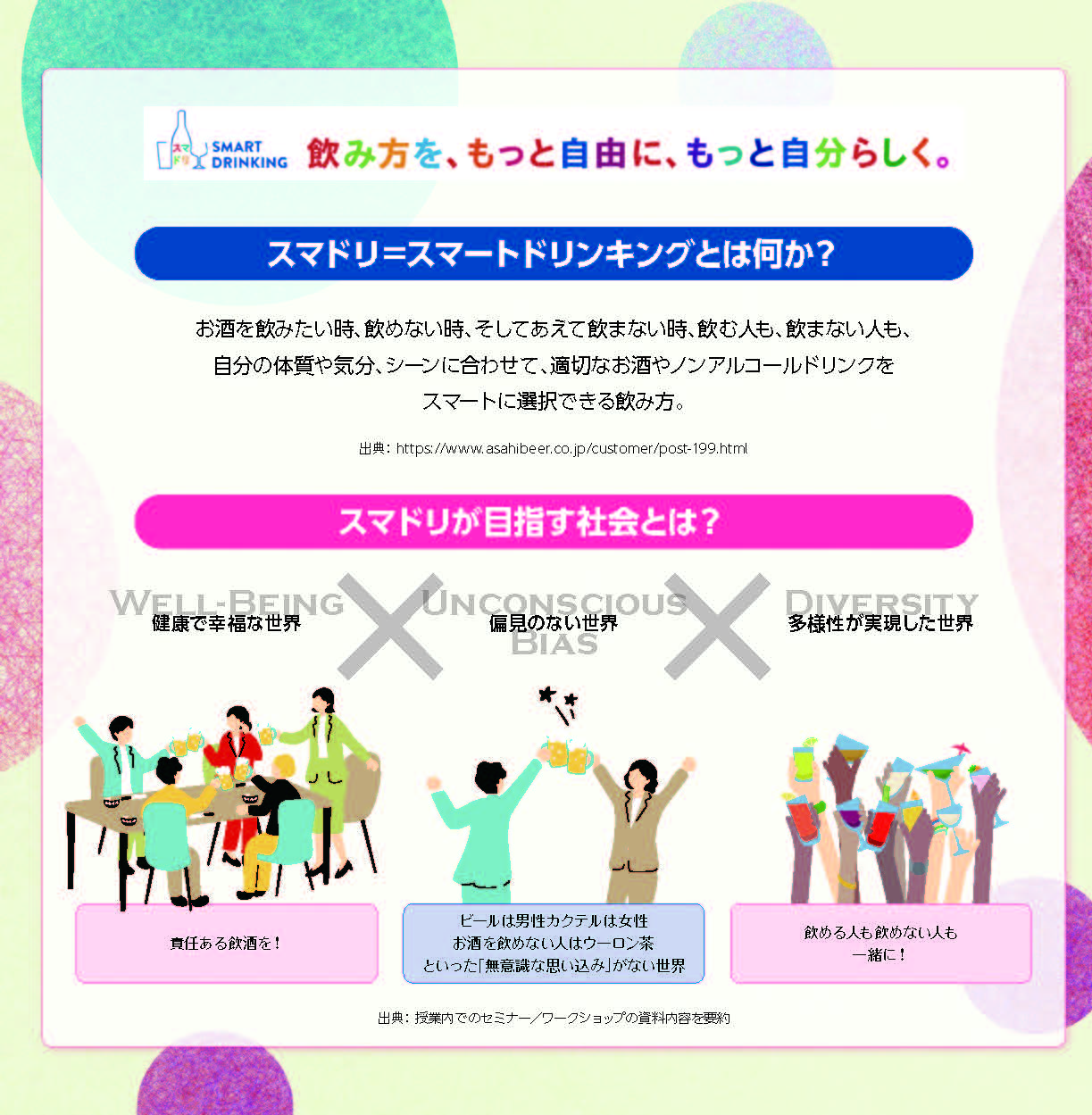 「スマートドリンキング」(スマドリ)とは、お酒を飲みたい時、飲めない時、そしてあえて飲まない時、飲む人も、飲まない人も、自分の体質や気分、シーンに合わせて、適切なお酒やノンアルコールドリンクをスマートに選択できる飲み方をいいます。そして、スマドリが目指す社会とは、健康で幸福な社会、偏見のない社会、そして、多様性が実現した社会です。そうした社会をめざして、スマドリをいかに普及させるか、ゼミ生で考えました。