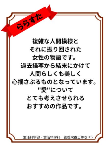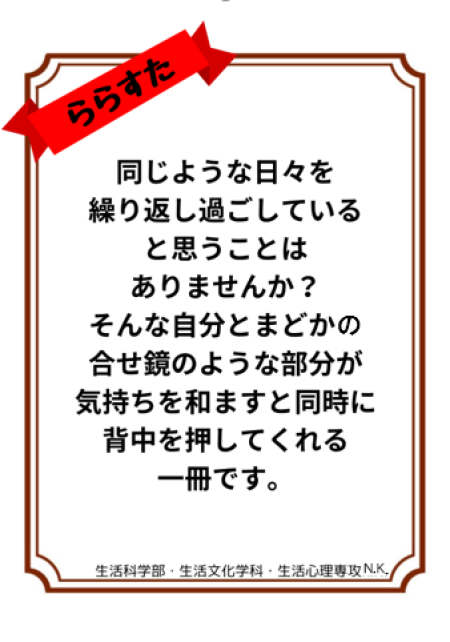 今回のららすた展示はいつもと様子が違います。 表紙を隠した状態で、ららすたがおすすめの一冊を紹介します。 テーマは「物語」です。普段、自分では手にしない新たな本との出会いを楽しんでみませんか。 ぜひ、図書館にご来館ください。 展示期間:2024年6月13日(木)~ 9月26日(木)