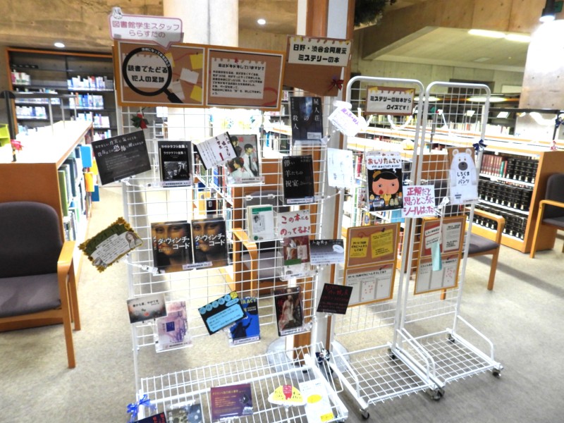 今年で4回目となる合同展示のテーマは「ミステリーの本」です。ららすた(渋谷)では、夏休みに開催した「ホラー・ミステリーの本」展示から、参加希望の学生が選んだ図書とPOPを出品しました。これらをららすた(日野)の展示資料と合わせ、常磐祭来場者や日野キャンパスの学生が直接手に取れるよう準備しました。