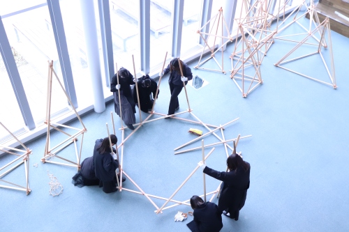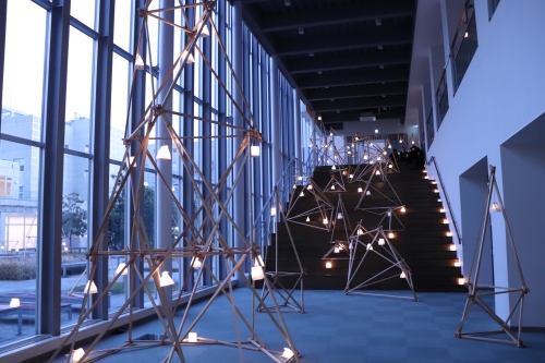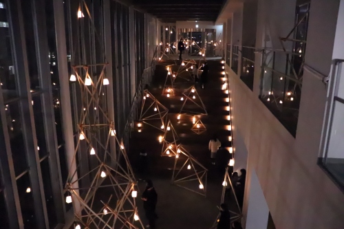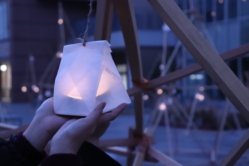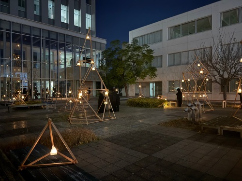 「光の庭」は実践女子大学 環境デザイン学部環境デザイン学科建築デザイン研究室で学ぶ3・4年生が中心となって企画・制作している光のインスタレーションになります。使用される照明は木の角材で作れられたシンプルな構造体の櫓(やぐら)と1枚のトレーシングペーパーでLED電球を包みこんで構成されています。
