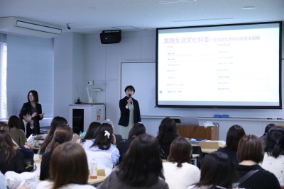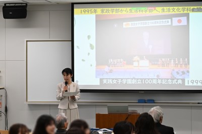 まずは、現職の教員、助手の皆さんの紹介の後、難波雅紀学長のメッセージが代読されました。「この30年間、変化する社会と人々の暮らしに寄り添い、現代的課題を解決できる多くの人材を送り出してこられたことに敬意を表します」と、難波学長は生活文化学科の取り組みをたたえました。