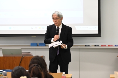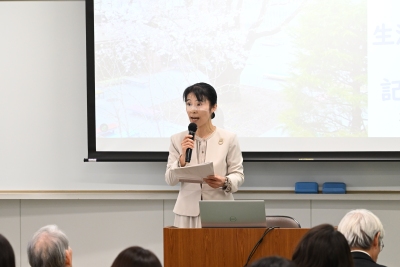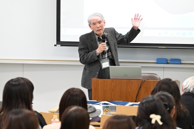 井口教授はこれまで生活文化学科の活動を支えてきた先人の尽力に敬服しつつ、生活心理専攻・幼児保育専攻それぞれの現在の学びについても紹介。日野市子ども包括支援センターみらいくとの連携にも触れ、「少子化、育児不安ななど教育問題が深刻化する現代社会だからこそ、生活者の視点に立って多様化・複雑化する生活課題を科学的かつ実践的に学ぶ必然性が増しています。今後も本学科の少人数制ならではの恵まれた学修環境を生かし、社会で自立して活躍できる次世代育成への貢献に尽力したいと思います」と結びました。