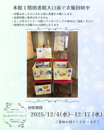 現在、本学の在学生を対象に12月17日迄、レディスの「冬物」衣料を回収中です。