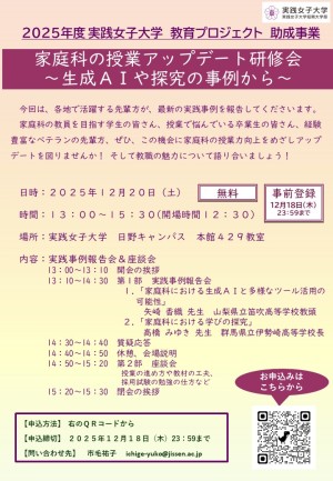 家庭科の教員を目指す学生の皆さん、授業で悩んでいる卒業生の皆さん、経験豊富なベテランの先輩方、ぜひ、この機会に家庭科の授業力向上をめざしアップデートを図りませんか! そして教職の魅力について語り合いましょう!参加対象は在学生の方、卒業生の方、実践女子大学関係者です。皆様のご参加、お待ちしています。