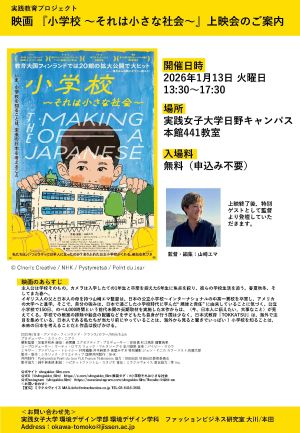本学の先進的かつ挑戦的な教育推進・教育改革の取り組み「教育プロジェクト」のひとつ「学生のウェルビーイングを高める取組 〜家庭科教育に着目して〜」(プロジェクトリーダー:市毛祐子教授)の今年度最後の活動として、1月13日(火)、本学の在学生・教職員を対象に、ドキュメンタリー映画『小学校—その小さな社会』の上映会を開催します。