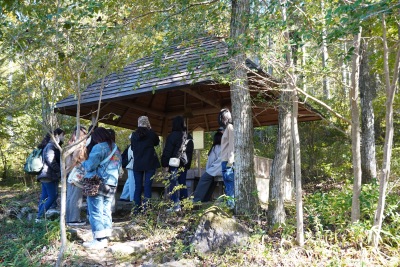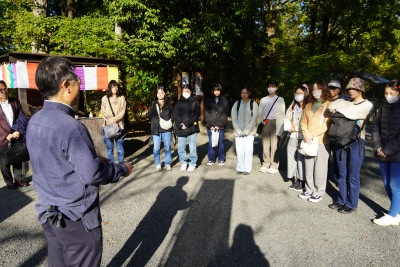 文学部国文学科の学生13人が11月8日、滋賀県大津市の和菓子メーカー「叶匠壽庵」の本社がある「寿長生(すない)の郷」という里山を訪れ、「国文学マーケティングプロジェクト」の授業の一環として、研修に参加しました。今回は施設の見学にとどまらず、「研修後に叶匠壽庵の企業案内を学生の視点で作成せよ」というミッションが課せられました。学生たちは、ミッション達成に向け、普段の国文学科の学習の知識を生かしながら、文学が企業経営や社員の意識にどう反映されているかなどを学びました。