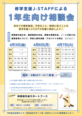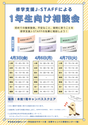 4月から始まる学生生活に、楽しみなことはもちろんですが、不安なことも多いかと思います。そこで、みなさんの不安をサポートするため、修学支援J-STAFFの先輩による「1年生向け相談会」を開催します!
