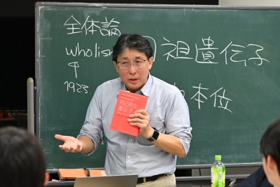 『利己的な遺伝子』を手に講義を進める佐倉教授