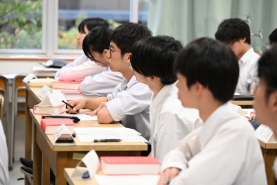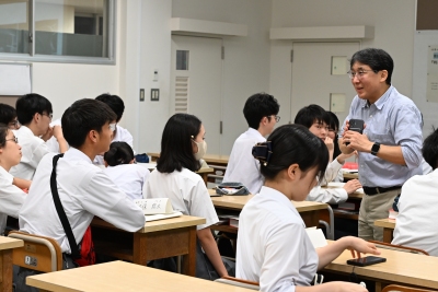 人間社会学部社会デザイン学科の佐倉統教授が10月4日、5日の2日間、母校の都立日比谷高校で集中講義を行いました。イギリスの生物学者リチャード・ドーキンスの世界的な名著『利己的な遺伝子』が来年、出版50周年となる節目に合わせ、佐倉教授の講義録を入門書として出版予定の紀伊國屋書店による特別企画。哲学、⽂化⼈類学、社会学、⼼理学など⽣物学以外のさまざまな分野にも大きな影響を与えた書物をひもときながら、佐倉教授は計9時間に及ぶ講義で、内容を多角的にとらえてわかりやすく解説し、生徒たちを深淵な生物の進化の世界へいざないました。