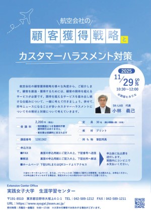 実践女子大学生涯学習センターでは、11月29日(土)に渋谷ヒカリエで開講する、特別講座“航空会社の顧客獲得戦略とカスタマーハラスメント対策”の受講生を募集いたします。