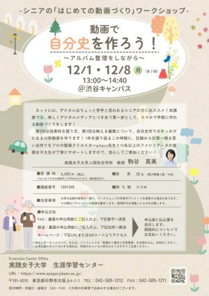 実践女子大学生涯学習センターでは、12月1日(月)と8日(月)の2週にわたり、渋谷キャンパスにて開講する、“動画で自分史を作ろう!~アルバムを整理しながら~”の受講生を募集いたします。