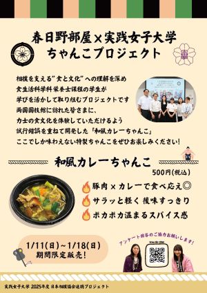 生活科学部食生活科学科健康栄養専攻(2026年4月から食科学部食科学科健康栄養専攻)の学生と公益財団法人日本相撲協会が連携した、オリジナルちゃんこを開発するプロジェクトから生まれた「和風カレーちゃんこ」が、東京・両国国技館で11日に初日を迎える大相撲初場所で販売されます。国技館のちゃんこは1日2000杯以上売れる人気のメニューです。食を学ぶ学生が、辛いものが苦手な子どもでも楽しんでいただけるよう、スパイスの加減に配慮した絶妙な辛さのちゃんことなっています。国技館でぜひご賞味ください。