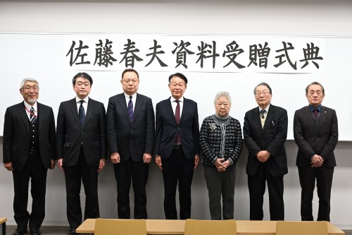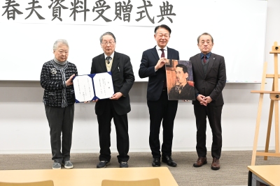 日本近代文学を代表する作家・佐藤春夫(1892~1964)の多数の資料を、遺族から出身地の和歌山県新宮市へ寄贈する受贈式典が1月24日、渋谷キャンパスで行われました。寄贈されたのは、書簡や原稿、美術資料など1万3000点超(写真カット枚数)。「門弟三千人」といわれる佐藤の人脈や交友関係、創作活動の解明が期待されます。客員研究員の河野龍也・東京大学准教授は「空襲の被害に遭わず、戦前からの佐藤春夫の資料が失われずに残ったのは極めて貴重で、佐藤春夫の全体像がさらに明らかになることを期待したい」としています。