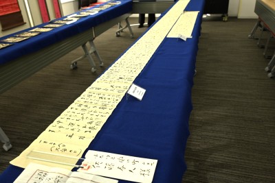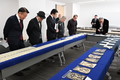 式典後、髙橋さんと新宮市の関係者は、17階のファカルティラウンジに移動し、寄贈資料の一部を見学しました。河野准教授が案内役を務め、髙橋さんや市長、館長らに対し、資料の背景や学術的な見どころを説明しました。