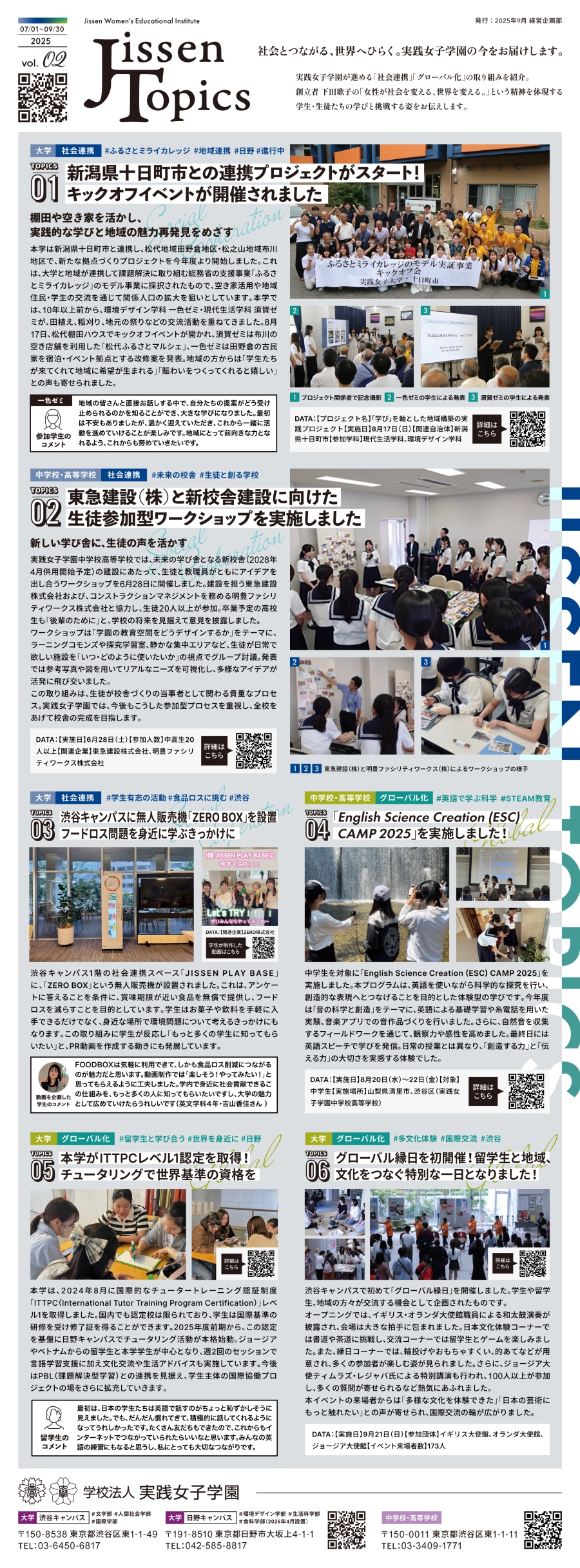本学園が進める「社会連携」「グローバル化」に関する学生・生徒の取り組みを紹介する広報ツール「Jissen Topics」第2号を発行いたしました。