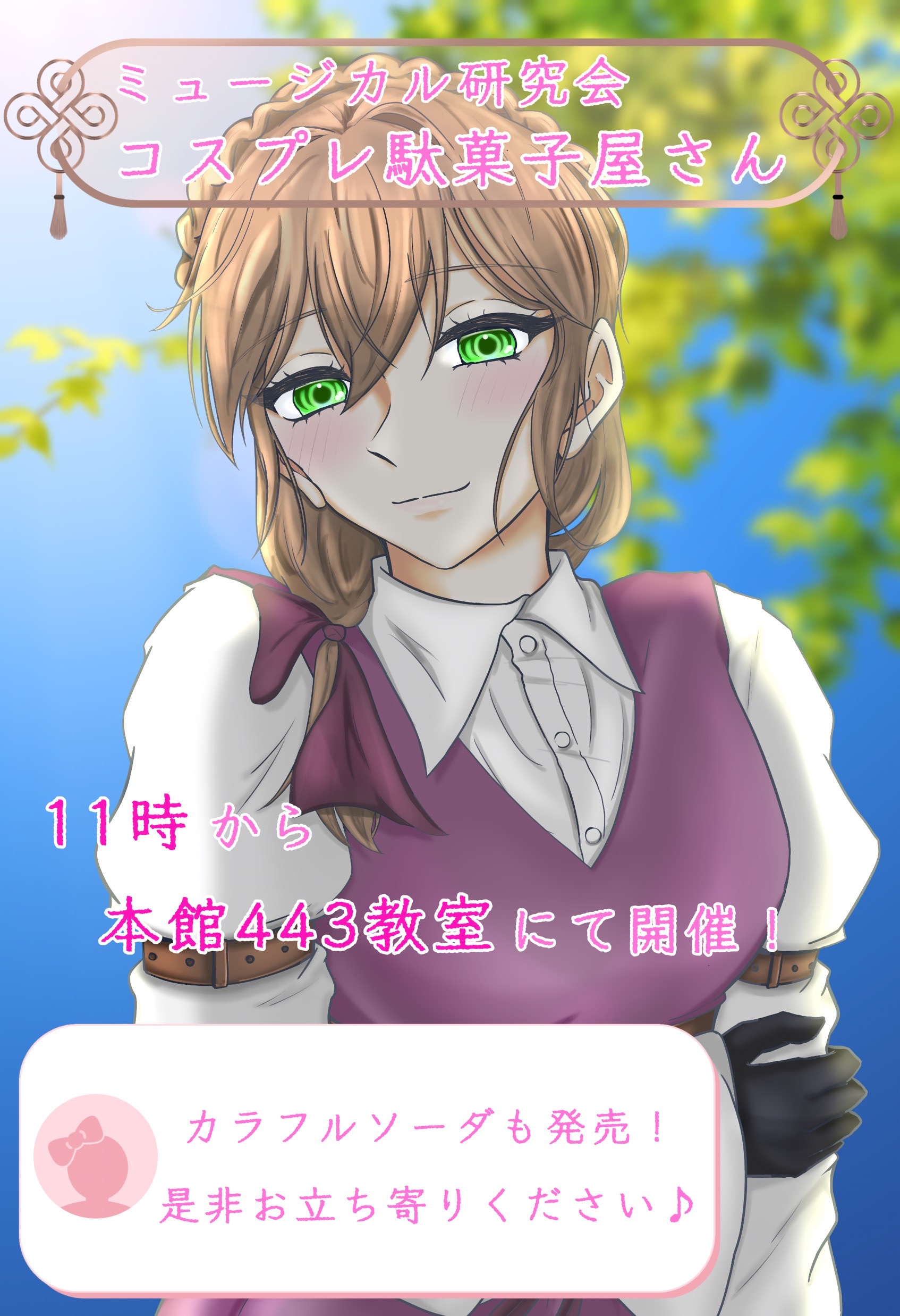 こんにちは!ミュージカル研究会です♪ 本館443で駄菓子屋とカラフルソーダーの販売を行います!コスプレをした部員たちがお待ちしております!フォトブースでの撮影や交流もお待ちしております!ぜひ遊びに来てください〜!