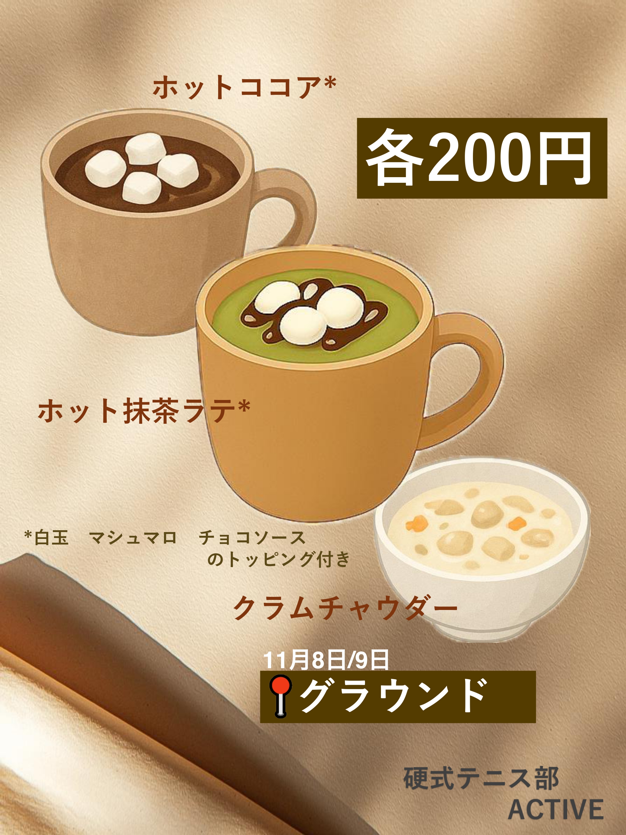 硬式テニス部ACTIVEが心を込めてご用意!温かいドリンクで皆さんをお待ちしています!!