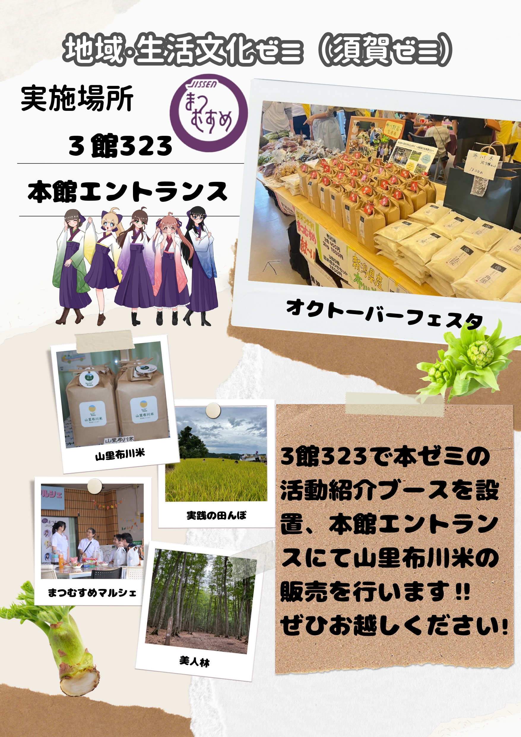 本館1階ホワイエ前で布川のお米販売と、3館323で須賀ゼミの活動の展示を行います。是非お越しください!