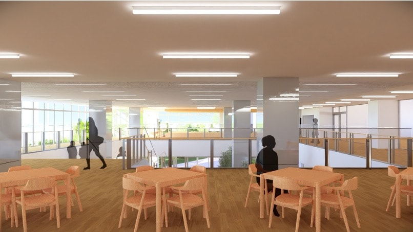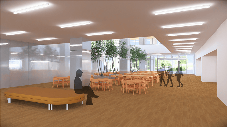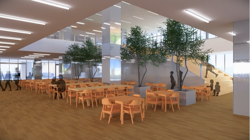 新校舎に入ってすぐ広がるコモンズ。生徒が集い、学び、くつろげる多目的な空間です。